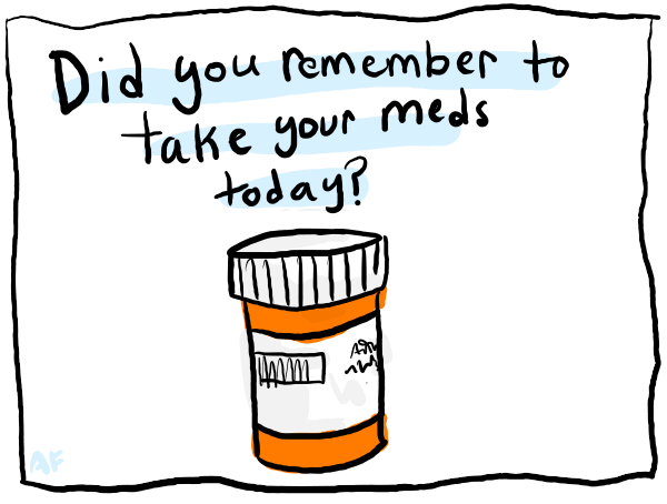 [Caption; A cartoon pill bottle on a white background sits below the words: “Did you remember to take your meds today?”]