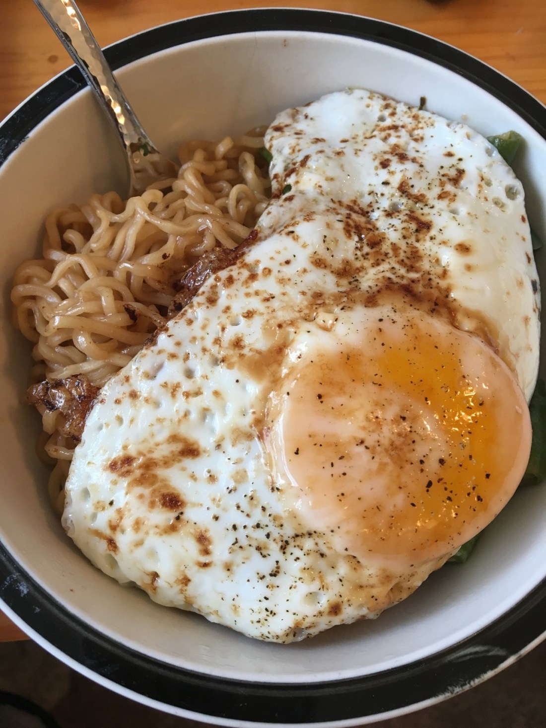 @gallusrostromegalus Tonight’s dinner is my trusty ramen “stir fry”! I boil and drain the noodles (gets rid of some of the extra fat), then cook them with soy, teriyaki, Worcestershire, sesame oil and frozen veggies. I top it with a fried egg that I sprinkle with the ramen flavor packet instead of salt. It’s probably my favorite fast cheap meal, I spent the better part of a year tinkering with it. I just wish my green onions hadn’t all gone south while I was out of town
