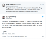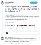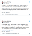 (and as for the concern that covering trans healthcare is too expensive for a “small” company like Dark Horse: Barry Deutsch offered a rebuttal with evidence here: https://twitter.com/barrydeutsch/status/1005941450264068096, but beyond that, what Jay is alleging is more than just coverage but that it is part of a systemic culture from management that is hostile to queer and trans people (& to criticism) )