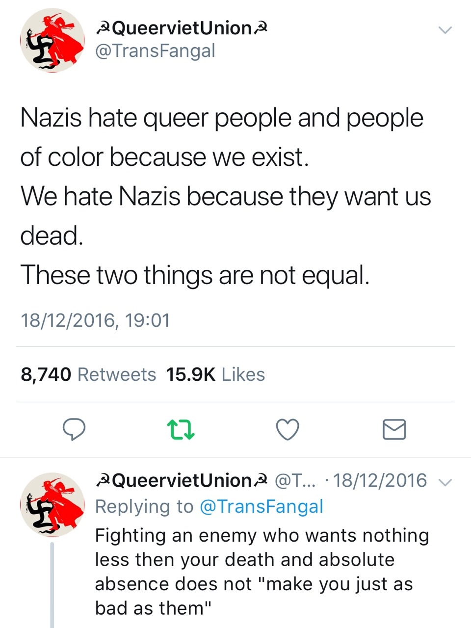 I legit served a man at my last job who was fully covered in nazi symbols and shit. He was a proud actual real life nazi getting icecream in a family theme park and when he left I voiced my disgust to my coworkers on how security even let him in the gate wearing all of that. And you know what that bitch said? “Well some people are offended by your rainbow flag and you are allowed to wear it so he can too”. It’s not the fucking same. Don’t fucking compare the two