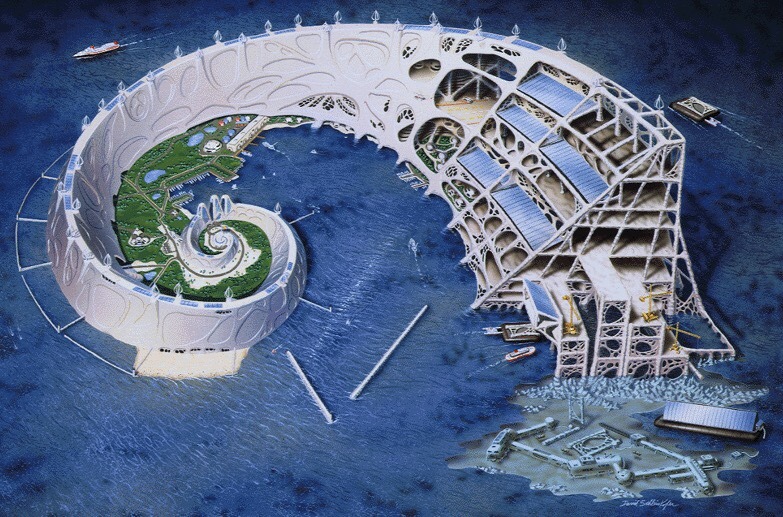 A self-assembling city from the sea: Architect Wolf Hilbertz’s Autopia Ampere builds itself, more or less organically, via the process of electrodeposition. All you basically need are the sea and the Sun.