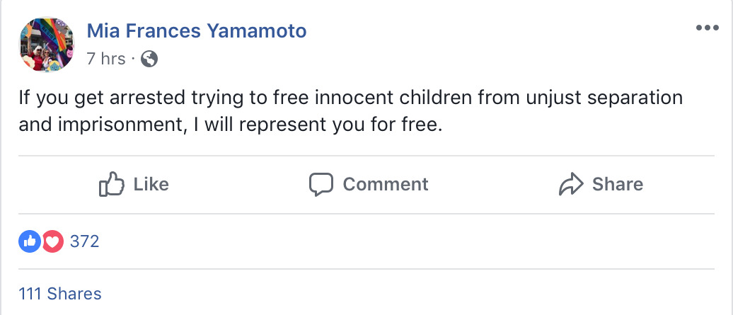 [ image is screenshot of facebook post by Mia Frances Yamamoto that says, “If you get arrested trying to free innocent children from unjust separation and imprisonment, i will represent you for free.” ]