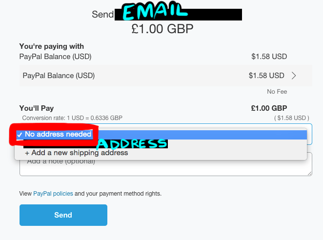 Be sure to select “No address needed”, it is very important that you do. If you leave your address in there, Paypal will assume that you are to receive a physical package. A physical package which needs proof that exists physically. Paypal will want the artist to provide shipping labels and tracking info on said package. This is bad, very, very bad. Artists can get in trouble if they cannot provide these things.