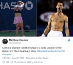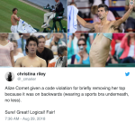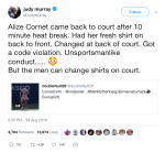 The players were given a 10-minute break to cool off and rehydrate, during which Alizé Cornet put on a fresh shirt. When she returned to the court, she realized her shirt was on backward. She quickly took off the shirt and put it back on, prompting umpire Christian Rask to hit her with a code violation.