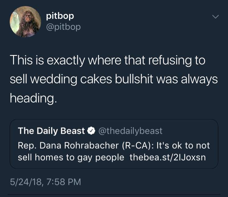 It’s called the foot-in-the-door method. First, you propose something that is slightly outside of allowable norms: denying gay people wedding cakes on grounds of “religious freedom”. Then, you slowly ramp up how extreme your demands are, coercing the other side to giving a tiny bit of ground each time, until you’ve shifted the entire fucking playing field. Conservatives are also very fond of the door-to-face method, which is demanding something completely outlandish that you know will be refused, and then asking for something less ridiculous by way of compromise, again resulting in a gradual shift in norms until views that were once considered moderate or reasonable become unthinkably liberal by destroying people’s sense of standards. The combination of these methods is called the “foot-in-the-face” method, which sums up where this whole thing is headed quite nicely.