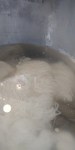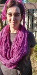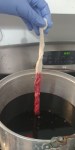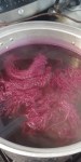 We ground the bugs to powder, steeped them overnight, then stewed and strained out the liquor for the dyebath about five times till we’d extracted as much colour as we could. The fibres soaked for about an hour in alum and cream of tartar to intensify the colour, then they went into the dyebath for about a half hour, going from pink to purple about halfway through. Then they were thoroughly rinsed in cold water and hung to dry, then balled off (prompting Questions from some neighbours who get to witness my various balcony crafts)
