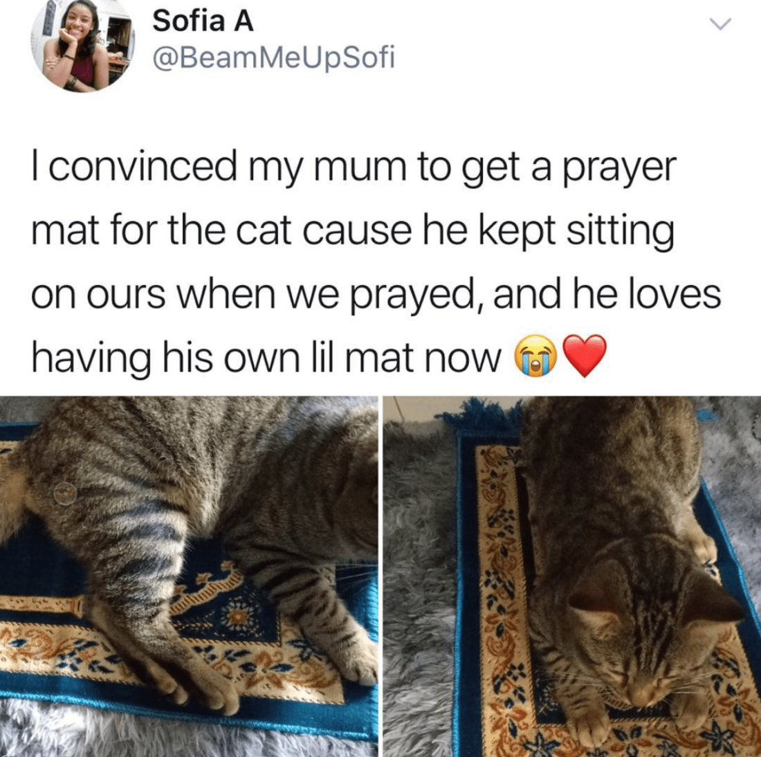 he’s mirroring! cats do that to be social that’s also why they will lie on laptops or books. they want to do what their humans are doing because they enjoy being in the same room and socializing that way. getting him his own prayer mat was a really good idea bc now he gets to mirror without being in the way!