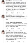 The girl’s mom tried to discourage me. She said it was late, I said my mum didn’t care. She said I could sleep on the couch. I said I wanted to go home. She said I was upsetting her daughter, I said she was mean to me.