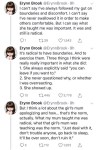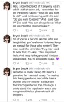 [Image description: a twitter thread by user Erryn Brook. It reads as follows, spread out over several texts: “I want to tell you a story about how my mum taught me that I’m allowed to leave an uncomfortable situation.