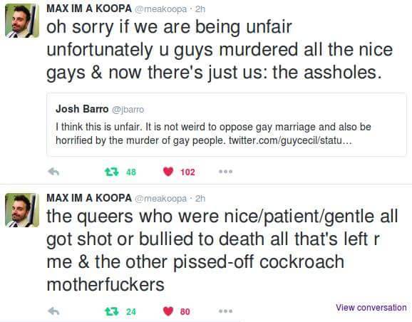 “Listen.” He said. “I served in the military. 10 years in the army, and had to keep my mouth shut and pretend. I had to pretend to everyone, until I just got sick of it and decided fuck you all. I haven’t been nice in years. Everyone saying I should shut up can kiss my ass.”